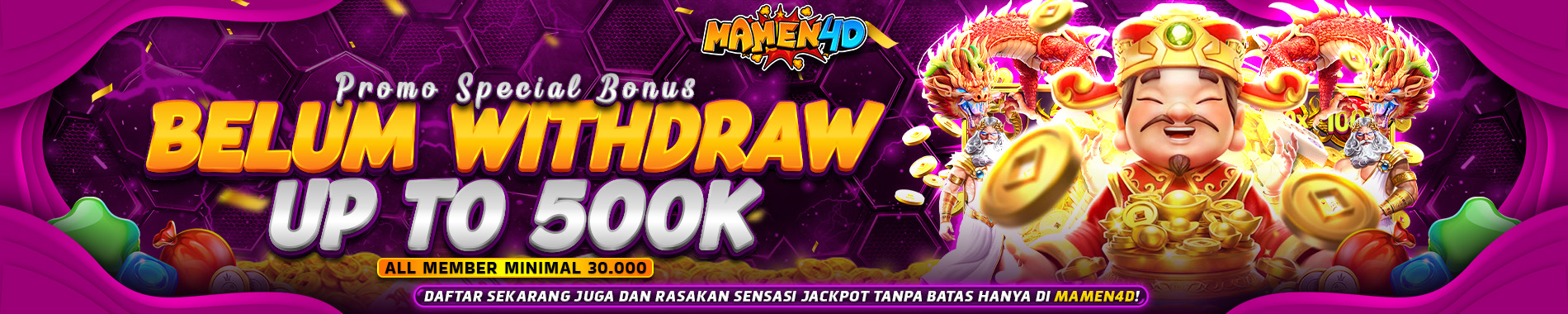Slot online merupakan kategori permainan paling populer di Mamen4d dengan ratusan pilihan game yang tersedia. Setiap mesin slot di Mamen4d hadir dengan tema unik, fitur bonus menarik, dan potensi jackpot yang menggiurkan. RTP atau Return to Player pada slot Mamen4d termasuk yang tertinggi di industri, memberikan peluang menang yang lebih besar bagi para pemain.